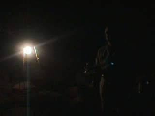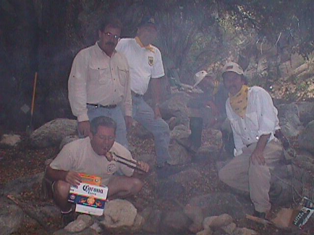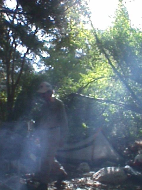 ![]() Here I am expressing my gratitude for having to cook the first evening's dinner. As you can see, I'm quite delighted with the prospect. It's always fun teetering over an open fire and placing food on a shaky grill after 8 - 10 shots of tequila. |