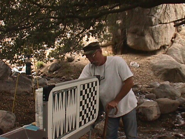 ![]() Here's Loren playing a simultaneous game of vertical backgammon and vertical checkers with himself. The cane is used for beating people who try to give him advice on how best to proceed when he gets stuck.. |