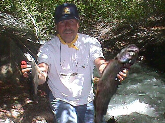 This picture took me quite some time to get on the web, because I had to steal it from Dave's dreams, which are always pretty strange and difficult to navigate. The fish in his right hand is the one he actually caught; the one in his left the fish he remembers catching. |