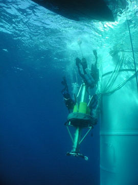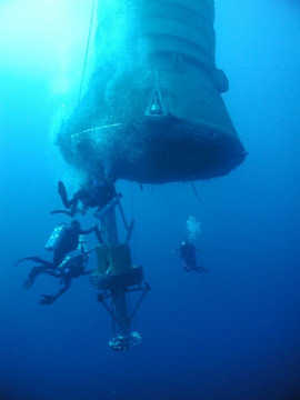 The next two pictures I had never seen before, until very recently. This is a team of diver's who are preparing to plug one of the Space Shuttle's expended solid rocket motors. These motors fall into the sea, assisted by parachutes, and are plugged and then floated back to shore where they are reused. |